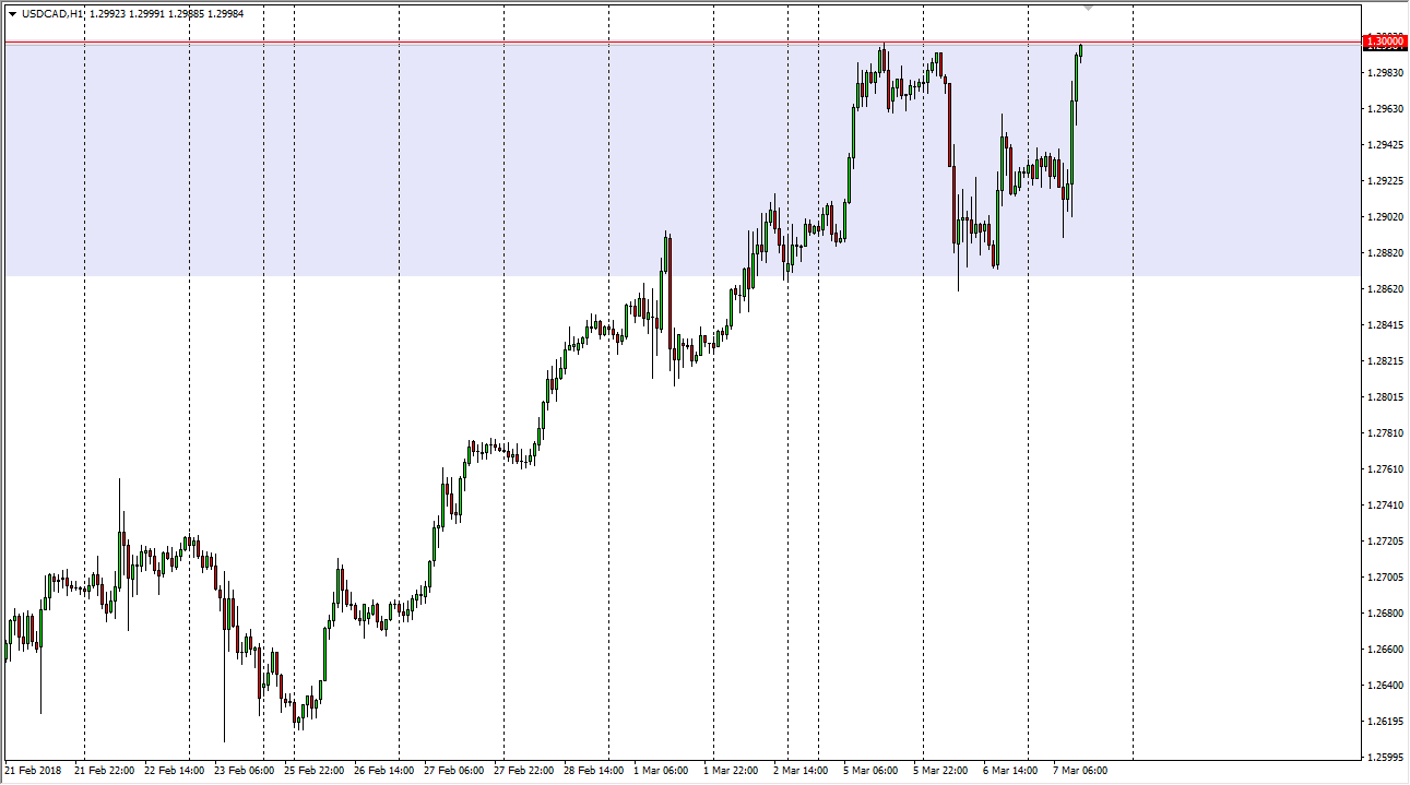 The US dollar has exploded to the upside during the trading session on Wednesday, reaching towards the 1.30 level against the Canadian dollar. This is a massive barrier, so I’m paying a lot of attention to this region, and I think that we are eventually going to break above there.