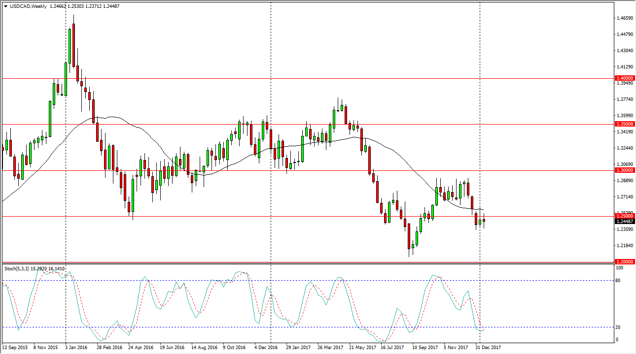 The US dollar has gone back and forth during the week, testing the 1.25 level above, and the 1.24 level on the bottom. The resulting neutral looking candle suggests that we are looking for some type of clarity in the market, and because of this I think that the patient long-term trader will end up doing well, but those of you looking to jump into the fray right away, you should be looking at short-term charts for more of a back and forth type of situation. A break above the shooting star from a couple of weeks ago could send this market higher, perhaps the 1.29 level acting as a target.
