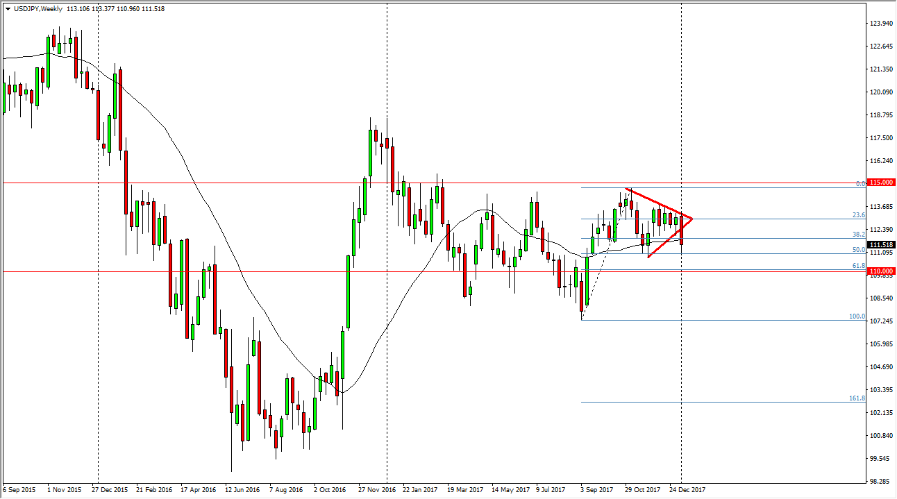 Although this week was very negative, we bounced from the 50% Fibonacci retracement level from the larger move, the 111 level. This is significant, so I think it’s only a matter of time before the buyers get involved. However, I would not look for massive moves anytime soon, I think this continues to be more of a sideways type of market, so looking for range bound opportunities on short-term charts will probably pay dividends. The longer-term trader will be frustrated as it is so tightly bound at several areas within reach. The 115 level above needs to be broken for a longer-term “buy-and-hold” situation, just as a breakdown below the 110 level would send this market down to the 107.25 level. The problem is that there are so many moving pieces when it comes to the stock markets lifting this pair while having plenty of issues with the US dollar in general. In other words, it’s going to be a lot of back and forth fighting.