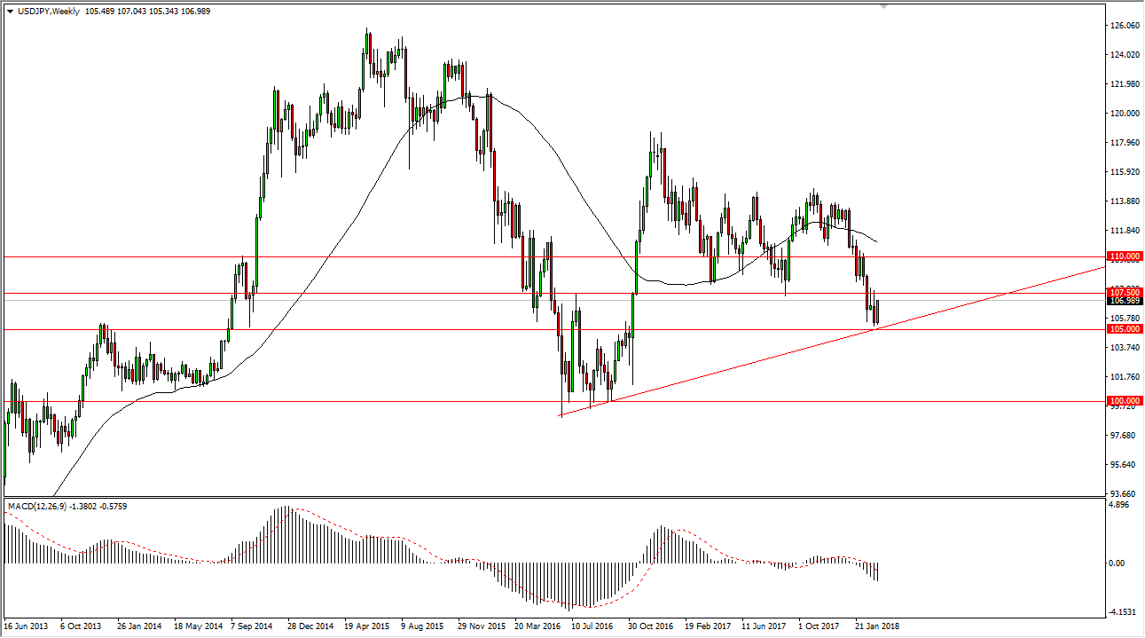 The US dollar has rallied a bit during the week, bouncing from the uptrend line that coincided nicely with the 105 level. That’s an area that should be support longer term, so I think at this point we are trying to build up a base from which to rally. If we can break above the 107.50 level, the market is likely to continue to go much higher, perhaps reaching towards the 110 handle. If we can break above that level, then the market goes much higher, perhaps reaching towards the 114 handle.