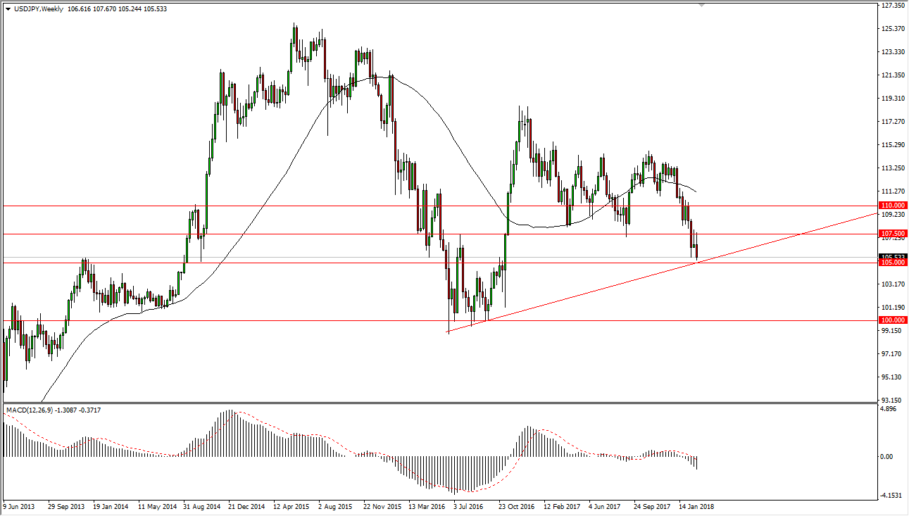 The US dollar has initially tried to rally against the Japanese yen during the week but found the 107.50 level to be far too resistive. We turned around from there and felt towards the 105 level, which coincides with a very nice uptrend line. I think this is going to be a very important area to watch, because if we break down below the uptrend line and the 105 level, the market is probably going to wipe out the entire move to the upside, reaching down towards the 100 level again. That would be a very strong sell signal, and at that point I would become aggressively short of this market.
