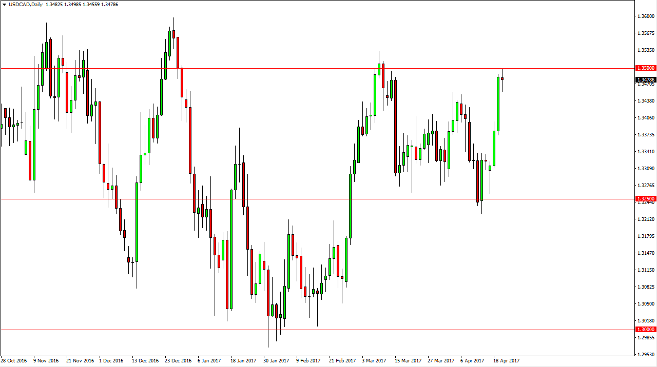 The USD/CAD pair rallied at the open on Thursday, but found the 1.35 level to be resistive enough to turn the market around. Because of this, I think that