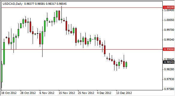 The USD/CAD currency pair rose during the session on Tuesday, but remains consolidating between the 0.98 and 0.99 handles. We think this pair will be one of the most sensitive to the so-called “fiscal cliff”, and as a result the market is essentially waiting to find out how that ends. It also is sensitive to the oil markets, and those are essentially consolidating as well. In fact, we think that until we get some type of resolution to the fiscal talks in Washington DC, this pair will do very little. If we get good news, this pair should break down as risk will reenter the market and people will flood into the Canadian dollar. Alternately, if we get bad news, a lot of times they will by the US dollar for safety.
