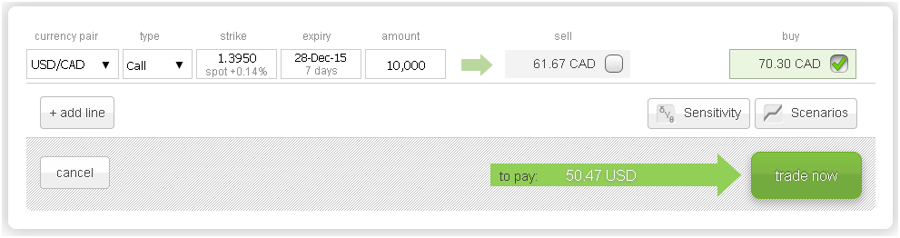 which gives you the right to buy USDCAD at a pre-set price (strike), for a pre-set date (expiry) and for an amount of your choice.