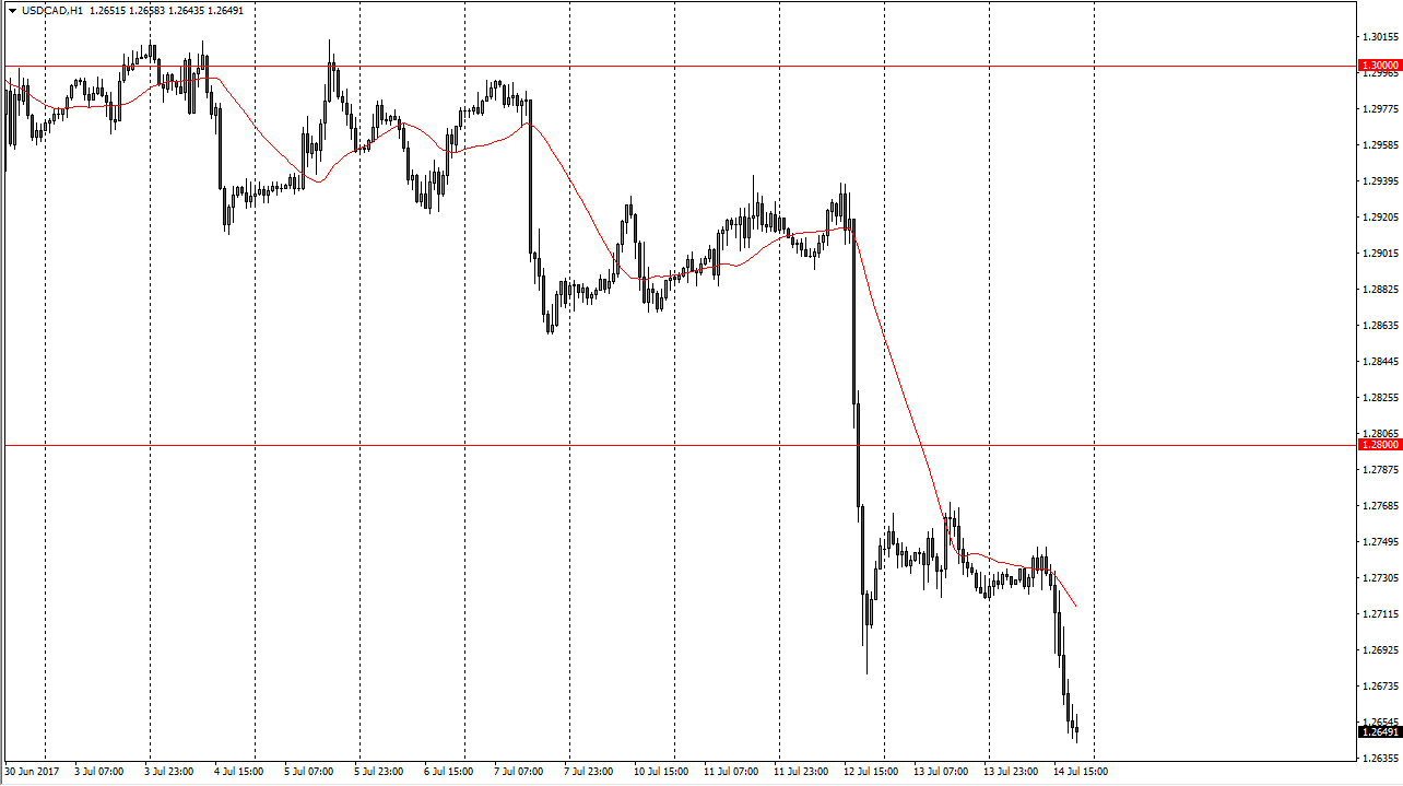 The US dollar went sideways initially during the session on Friday, but then collapsed after fairly weak inflationary numbers came out of the United States. This only exacerbates the differential between bonds in the US and Canada, and therefore sent this market much lower. I believe that we are going to go looking for the 1.26 level next, and then eventually the 1.24 level. The oil markets rallying could also cause quite a bit of bullish pressure as well, but that is probably a little less of an issue now that it typically is. This market has broken down through several major support levels, so it looks as if the Canadian dollar will continue to strengthen.