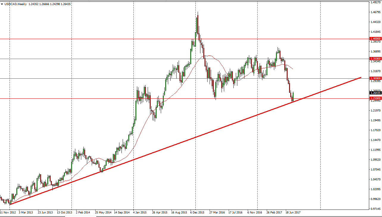 The US dollar rallied significantly this week against the Canadian dollar, and as the jobs number came in on Friday, the Canadian report missed, while the American report was much better. The market broke above the 1.25 handle, and formed an extraordinarily bullish candle. The candle wiped out the last couple of weeks, and more importantly bounced off the uptrend line on the longer-term charts. Because of this, I think that perhaps the market has finally found enough value to start buying again. While the oil markets are trying to show signs of life, I believe that the Canadian dollar is overdone. Remember, most of this trade has been about the bond markets, and now that it looks like the Federal Reserve is much more likely to raise rates due to the jobs market, I believe that the “buy Canadian bonds, short American bonds” trade is going to start unwinding.