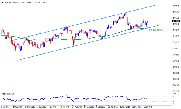 While seven month old ascending trend-channel favors USDCHF advance, the pair is more likely to accelerate its upward trajectory to 1.0125-30 immediate resistance, breaking which 1.0200 can act as an intermediate stop prior to its run-up to the November 2015 highs of 1.0330. However, pair’s further north-move beyond 1.0330 can be capped by the mentioned channel’s resistance-line, near 1.0500 round figure mark. Meanwhile, 0.9950 and the channel support, also comprising the 100-day SMA, near 0.9850, can limit the pair’s near-term downside. Should it break the 0.9850 on a closing basis, also drops below 0.9800 mark, the pair becomes vulnerable enough to test 0.9650-40 support-area.