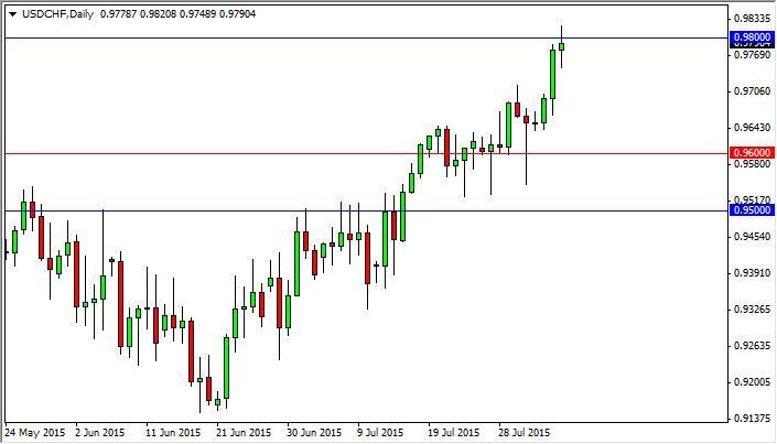 The USD/CHF pair went back and forth during the course of the day on Wednesday, testing the 0.98 handle. This is an area that is a large, round, psychologically significant number, and an area that we have seen resistance and previously. With this, it makes sense that we struggle to get above, but we look at pullbacks as potential buying opportunities. Quite frankly, we may just simply need to build up enough momentum to break out.