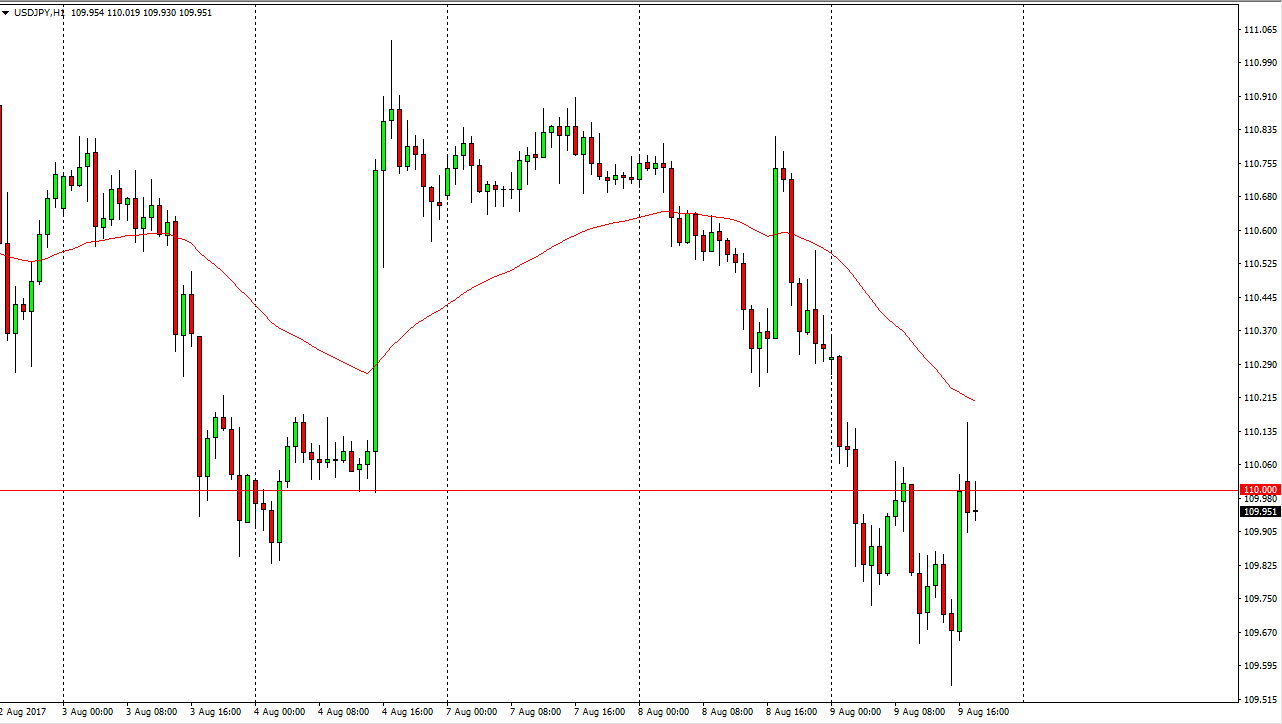 The US dollar was very choppy against the Japanese yen during the Wednesday session as fears over conflict on the Korean Peninsula hit the markets. We break down below the 110 level, which of course is a very psychologically important level, and have now tested that area a couple of times. It looks as if we are going to continue to see sellers in this market, but if we can break above the 110.25 level, I think at that point the market will begin to rally a bit more significantly. Otherwise, we will probably get down to the 109 level over the next several sessions.
