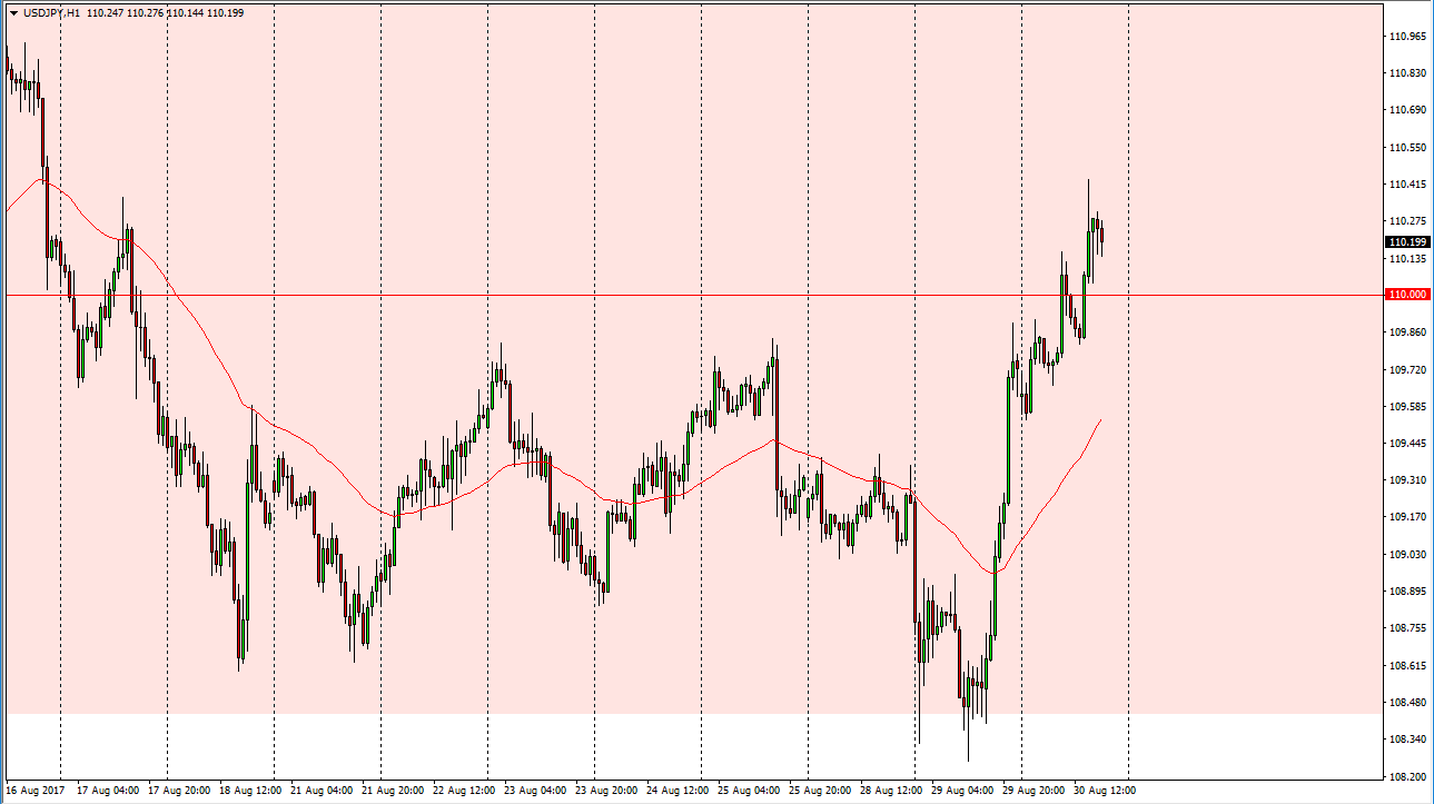 The US dollar exploded to the upside on Tuesday against the Japanese yen, and then continued that bullish pressure on Wednesday. We are now clear the 110 handle, and it looks a very likely to continue to see buyers jump back into this market. Ultimately, this is a market that should have plenty of buyers, due to the overreaction to the North Korean missile launch. Pay attention to stock markets around the world, if they continue to go higher, that should help here as the Japanese yen is considered to be a safety currency.