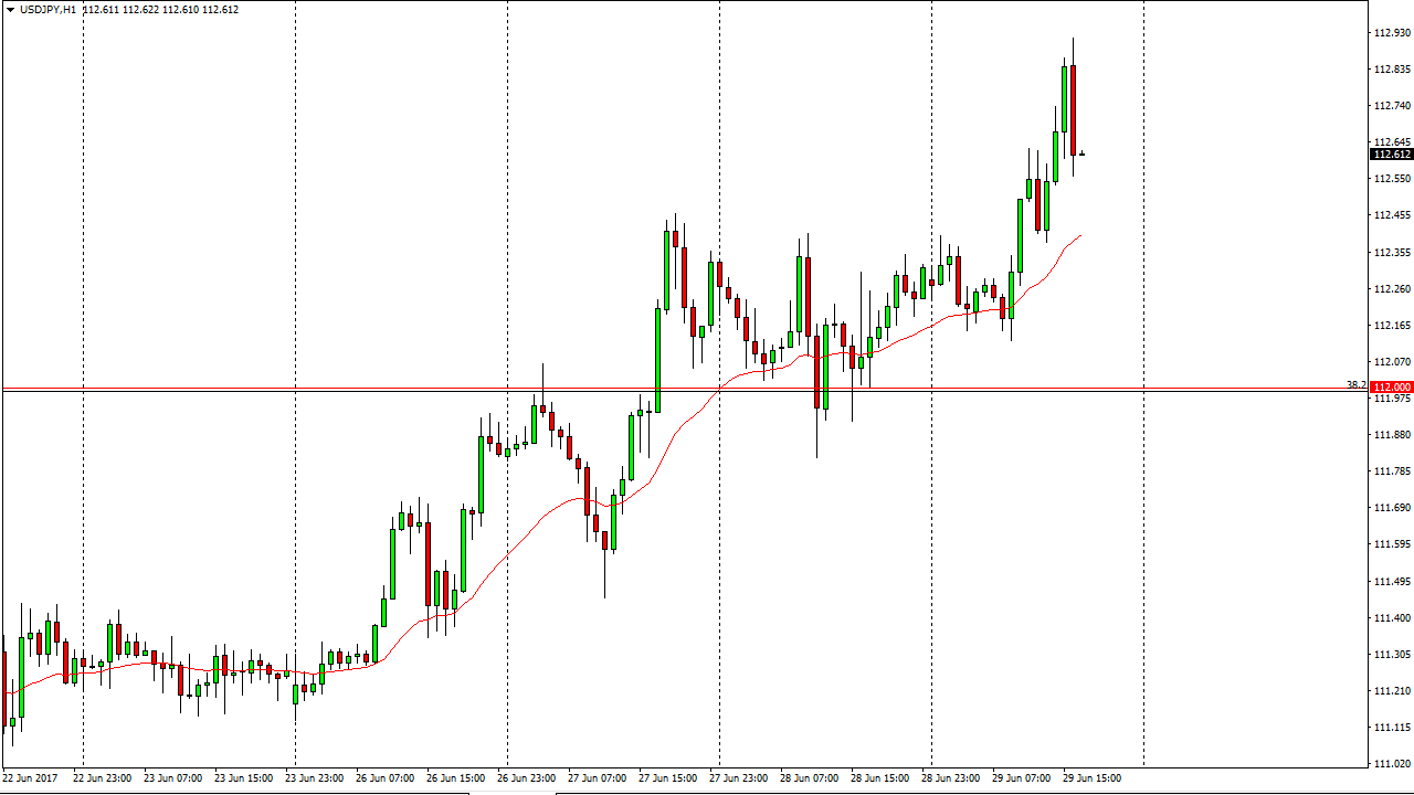 As I write this, the USD/JPY pair has seen buying pressure during the session on Thursday, but has pulled back from the precipice of the 113 handle.