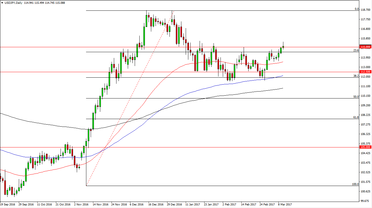 The USD/JPY pair rally during the day on Friday, breaking above the 115 handle. We are starting to run into a bit of resistance, but I think the pair is