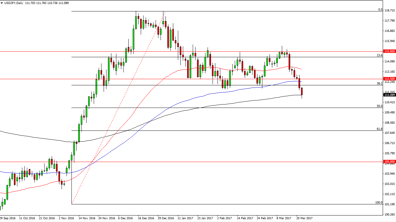 The USD/JPY pair fell during the day on Wednesday, testing the 200-exponential moving average. If we can bounce from here, that saves a certain amount of bullish pressure in a market that has broken down a bit. The stock markets around the world have trying to recover late in the day, so that could be a good sign for this pair. Nonetheless, expect a lot of volatility in the short term as we will either fall towards the 110 level which is the 50% Fibonacci retracement level, or try to break above the 112 level, which could be a sign of strength.