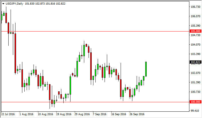The USD/JPY pair broke higher during the course of the day on Tuesday, testing the 103 level. I believe that this market will continue to rally due to the