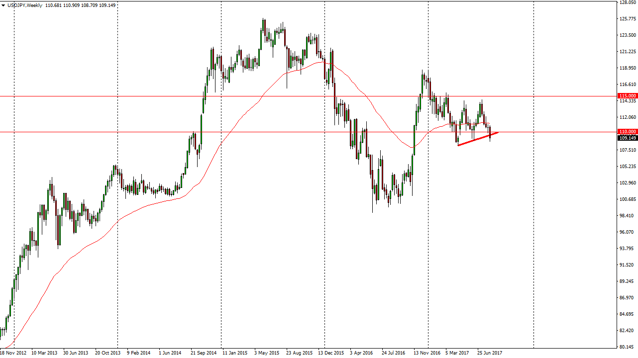 Risk appetite is a huge factor when it comes to this market, and of course there is also the interest rate outlook as far as we can see. Ultimately, if we break above the top of the range for the week, the market should go much higher. I believe that there will be a lot of volatility, as the situation is still quite fluid between the Americans and the North Koreans, so small position sizing will be probably the best way to deal with this market. If we do breakdown, I expect to see a significant amount of support at the 105 handle.