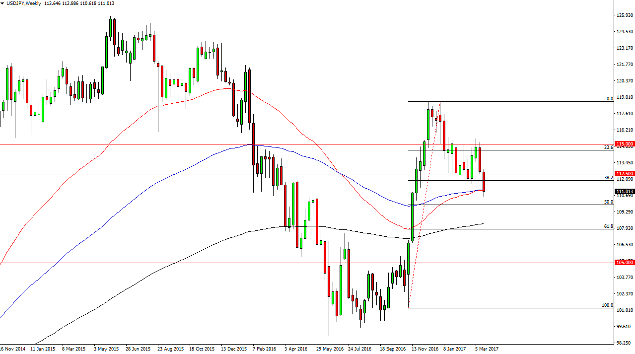 The USD/JPY pair broke down during the week, slicing through the 112 handle. If we can break down below the bottom of the candle for the week, I believe that the market will reach towards the 110 level. Any type of supportive candle in that area could be a buying opportunity as it is near the 50% Fibonacci retracement level, but I believe in the short term we are going to see a little bit more bearish pressure. If we broke above the 112.50 level, that could be very bullish though.