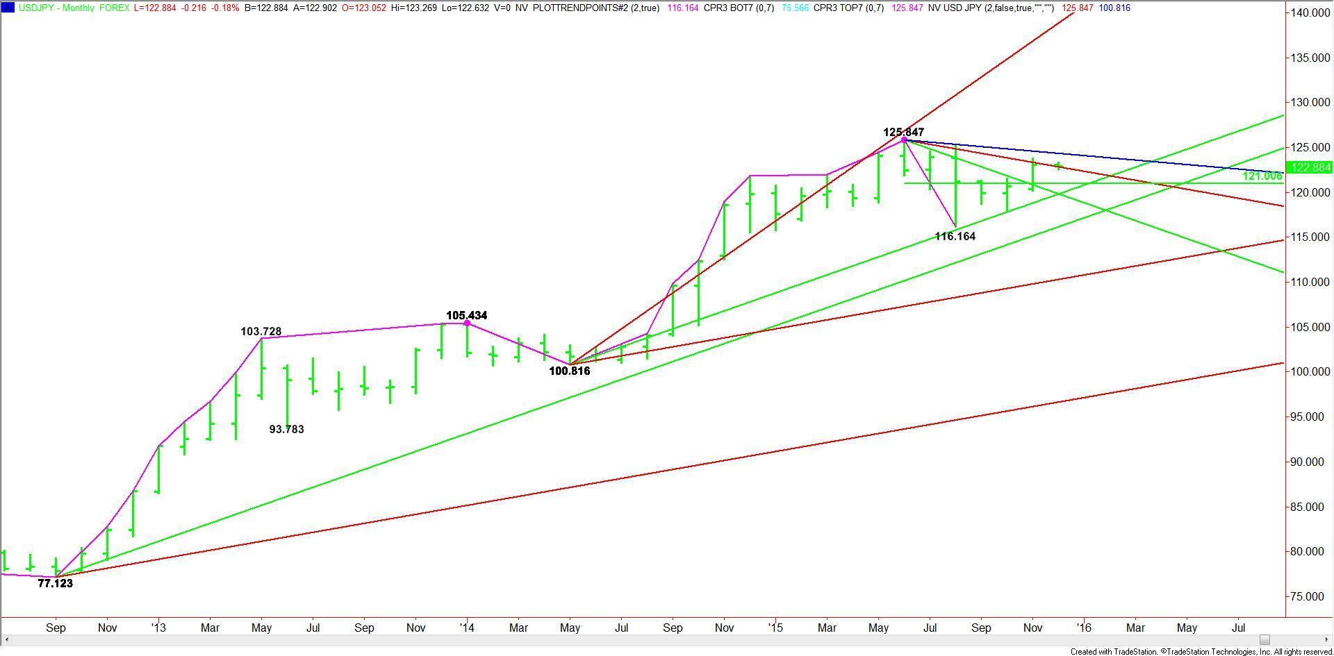 The USD/JPY closed at 123.100 in November, up 2.4550, or 2.03%. The catalyst behind the rally was expectations of a Fed interest rate hike in December. Look for the market to continue to find support because of the divergence between the Bank of Japan and the U.S. Federal Reserve monetary policies.