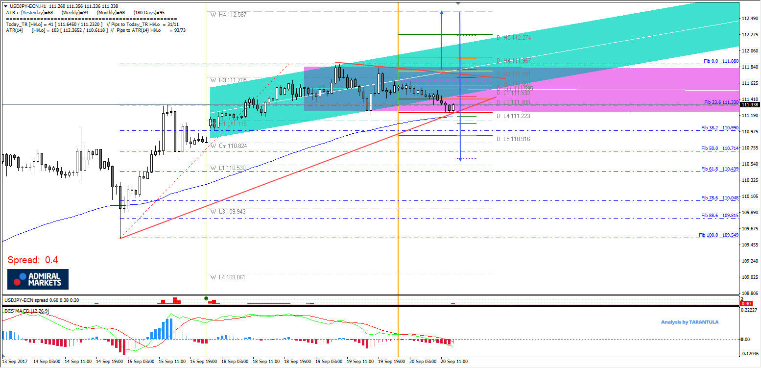 The USD/JPY is in a congestion phase (violet channel) waiting for the always important FED decision and FOMC conference. 112.60 looks attractive too sellers and a heavy momentum spike above 111.80 could get the price to 112.30-60 where it could start selling towards camarilla pivot points shown on the chart. A drop below 111.20 could target 110.90 and 110.60. The event is expected to be volatile so be prepared for price whipsaws in both direction.