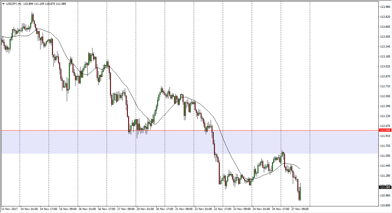The US dollar fell against the Japanese yen during most of the session on Monday, as we continue the downward pressure. Now that we have cleared the 111.50 level, I believe that the market is going to continue to go down towards the bottom of the overall consolidation area, that we have been in for several months, if and extends down to the 108 handle. This will be especially true as the US Congress cannot seem to pass significant tax bills. Ultimately, it’s not until we break above the 112 level on a daily close that I would be willing to buy now that we have made this breakdown. That is unless of course we formed some type of supportive action near the 108 handle, which has been so important and supportive in the past. I believe that the market will turn around is the US Congress can do its job finally.