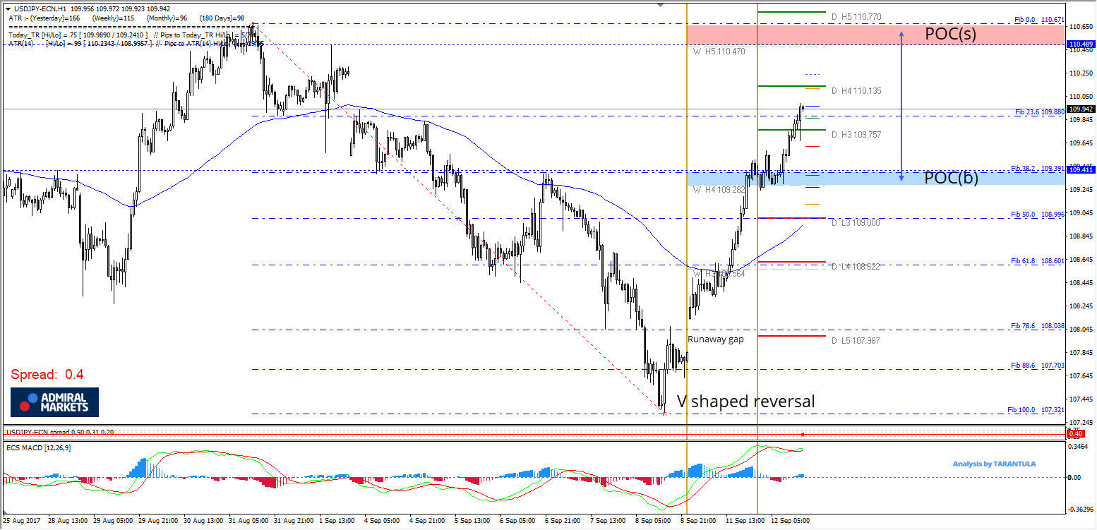 Technically, the USD/JPY is still in downtrend but it has a strong recovery, and the gap hasn’t been closed yet. 109.25-109.40 is the POC(b) buy zone (order block, W H4, ATR pivot) and 110.45-110.65 is POC(s) sell zone. At this point price is in no man’s land. If the price retraces to POC(b) we could see a bounce towards 110.13 and 110.50. If we see the price within the POC(s) then targets are 110.15 and 109.75. Above 110.75 we could see a stronger recovery. Watch for these zones.