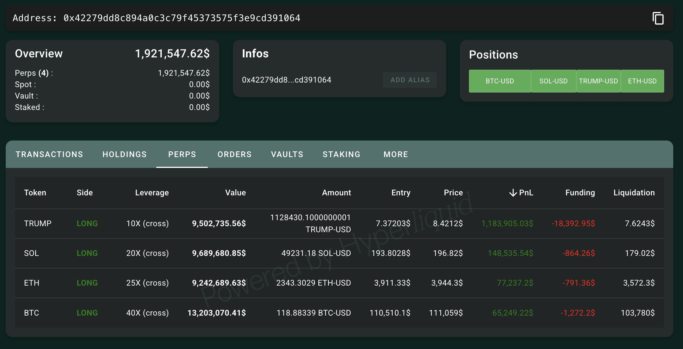 The same address is also long on SOL, ETH, and BTC, suggesting broader conviction in the risk-on rotation sweeping crypto markets.