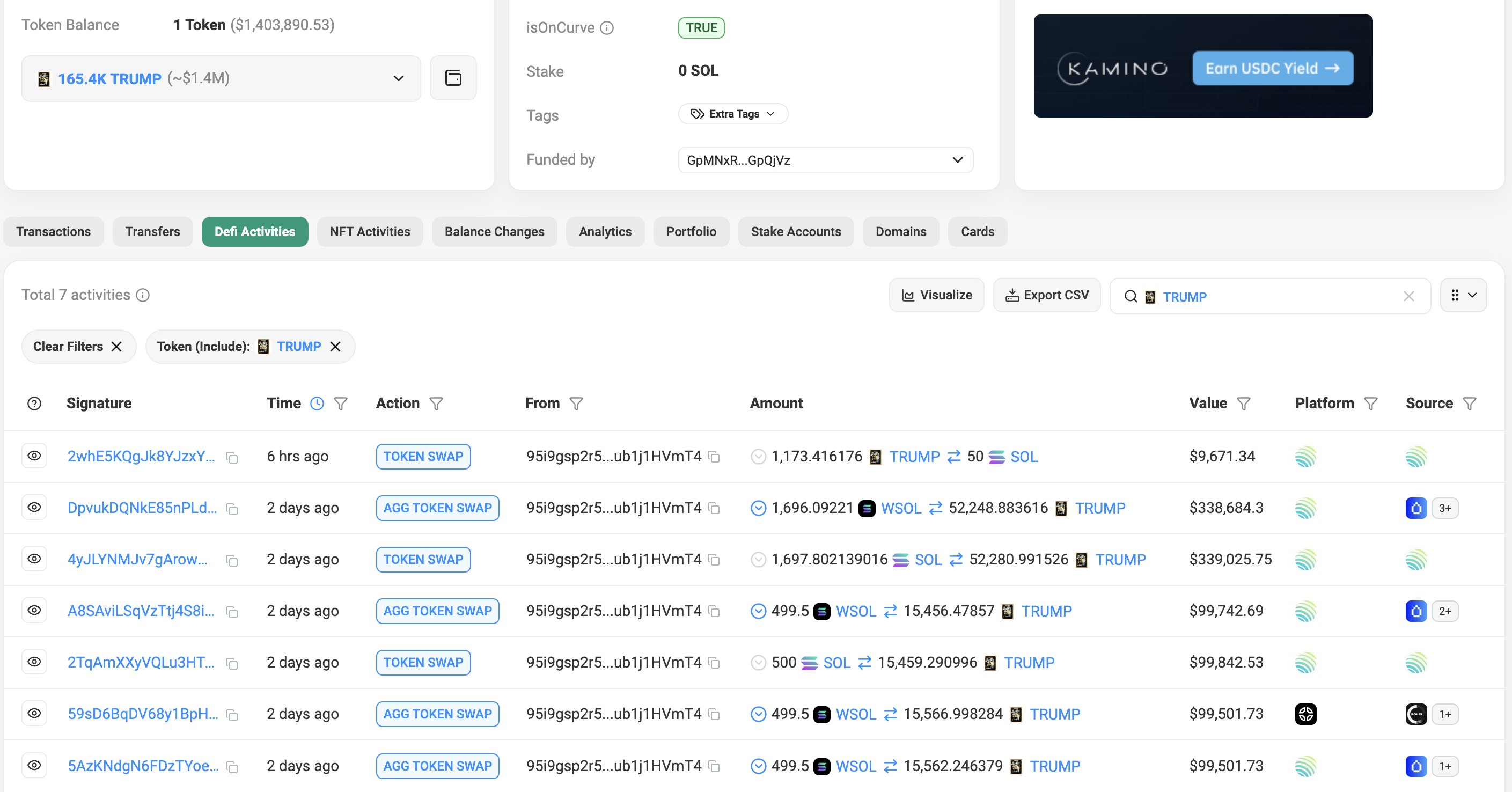 A new wallet funded just days ago spent 5,346 SOL (≈ $1.07 million) to acquire 165,401 TRUMP, now worth about $1.4 million, a $335,000 unrealized gain, according to onchain data shared by Lookonchain.