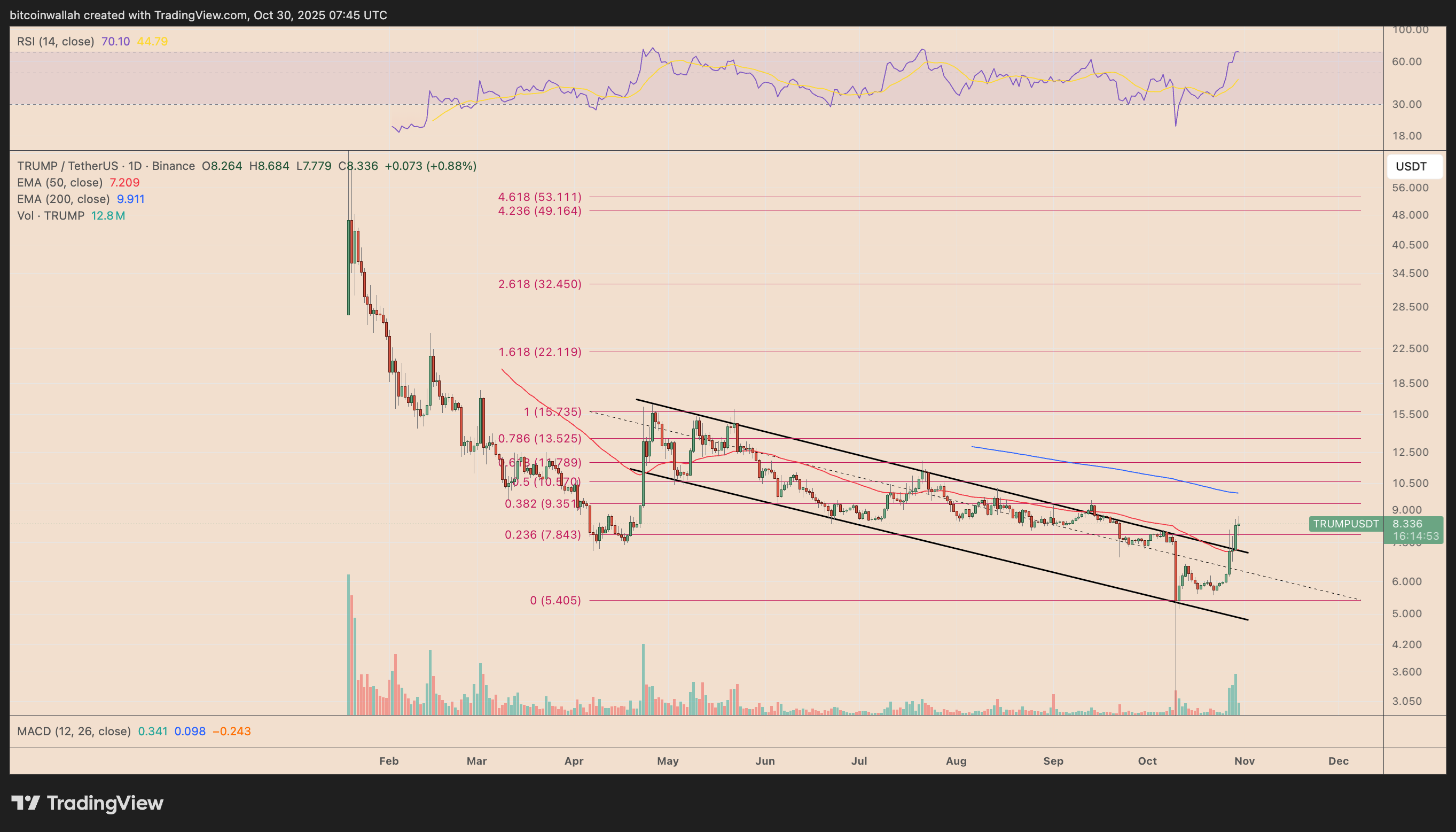An overbought correction can initially bring TRUMP lower by 5.30% to $7.85, a level aligning with the 0.236 Fibonacci level, the 50-day exponential moving average (50-day EMA; the red wave) and the upper trendline of the memecoin’s prevailing descending channel pattern.