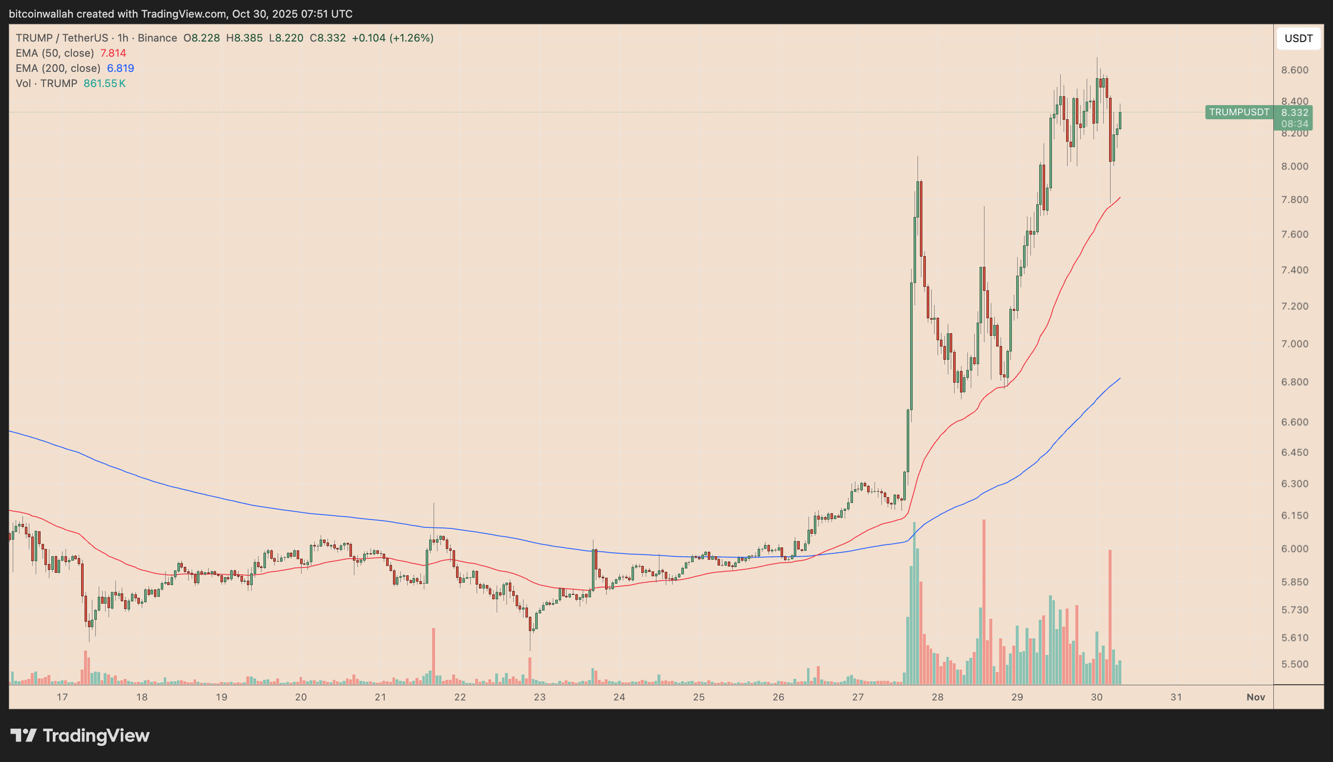 As of Thursday, TRUMP traded as high as $8.68, reclaiming levels last seen in September. The memecoin has surged more than 475% since the early October market crash, with nearly 55% of those gains coming just in the past week.
