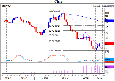 Wheat CME December contract Daily Forecast - 27 October 2014Wheat unable to break above 540 & collapsed through 521/520 all the way to the target of 510/509 & bottomed exactly here. This should mark the end of the recovery & the resumption of the bear trend. A break below 509 today targets 505/503. This is the best chance of a bounce for bulls but a break below 502 keeps the market under pressure & targets 495/494.