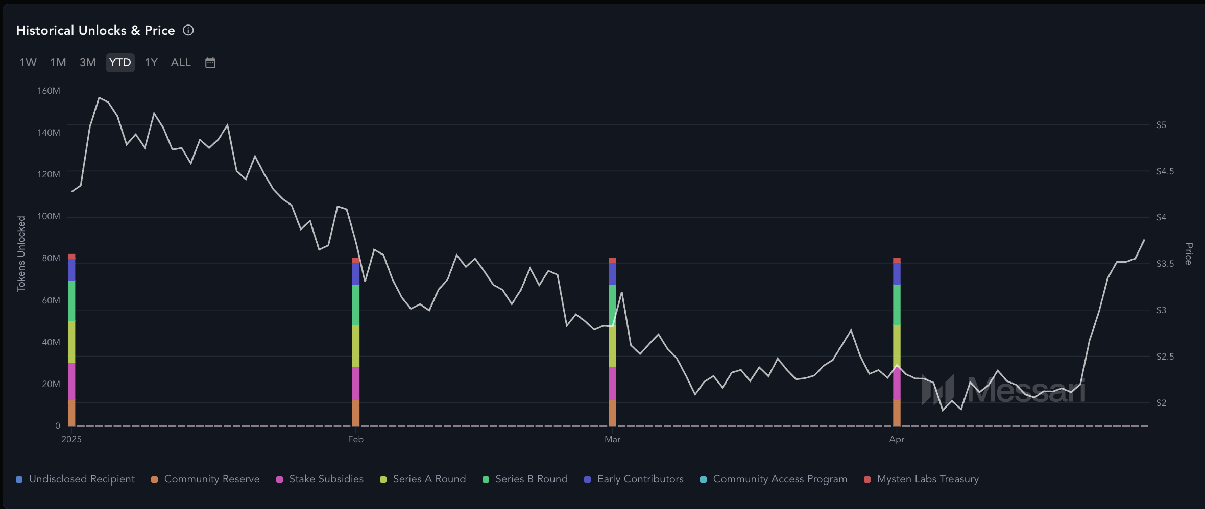 By April, SUI’s price had plummeted to as low as $1.92, representing a more than 50% decline from its January levels. This period coincided with two additional unlocks worth around $419 million, compounding selling pressure on the market.