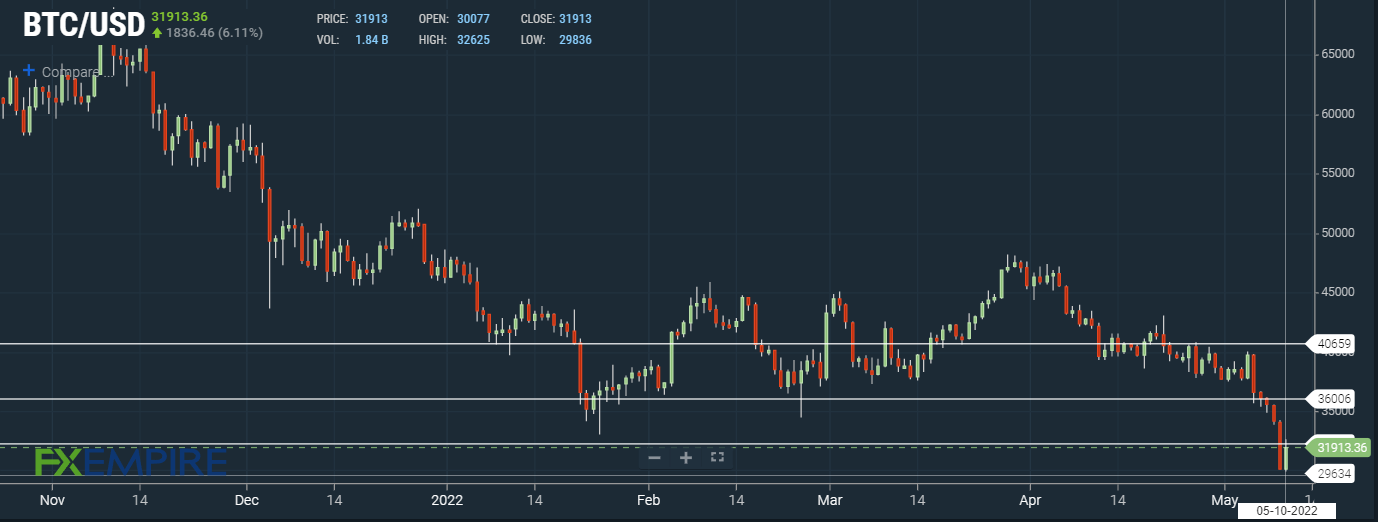 Bitcoin’s price was down by almost 50% from its November price high of $69,000. The top coin’s price tumbled by nearly 12% on Monday, ending the day at $30,077.