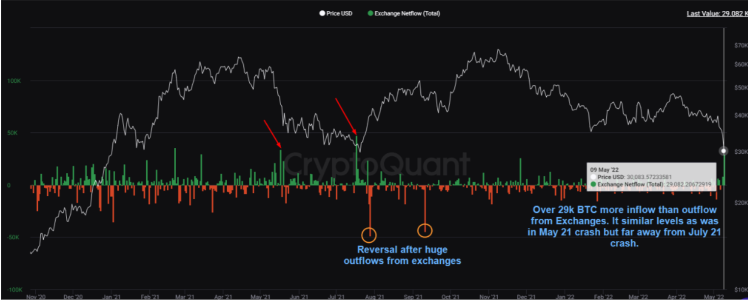 The May 9 exchange inflows were the most significant inflows to cryptocurrency exchanges in 2022, as the crypto market fell to July 2021 levels.