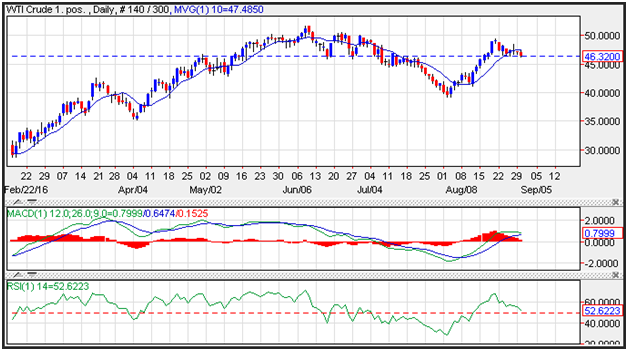 WTI crude oil prices fell to session lows of 46.22 from near 47.30 after the much better U.S. confidence data. Brent prices fell in tandem. The dollar strengthened, putting pressure on prices, with the USD advancing to levels last seen on August 10. Traders await inventory data which will be released after the closing bell on Tuesday by the American Petroleum Institute.
