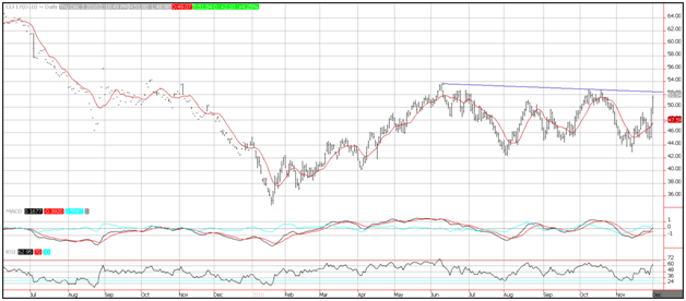 WTI crude oil prices surged higher for a second consecutive trading session, surging more than 4% following Wednesday 9% climb. OPEC announcement that they were cutting output by 1.2 million barrels per day has put a floor under prices. Resistance on crude oil prices is seen near a downward sloping trend line near 52, and then the October highs at 52.20. Support is seen near the 10-day moving average at 47.59.