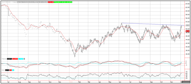 WTI crude oil prices moved higher on Monday but were unable to break through downward sloping trend line resistance. Support on crude oil prices are seen near the 10-day moving average at 48.66. Prices continue to be buoyed by OPEC announcement on Thursday that they were cutting production by approximately 1.2 million barrels per day.