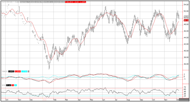 WTI crude oil prices rebounded off their lows but still moved down more than 1.25% following a larger than expected build in total petroleum inventories reported on Wednesday by the Department of Energy. Crude oil stocks built more than expected in Cushing Oklahoma where WTI is prices which also weighed on prices. Resistance is seen near the December highs at 52.45, while support is seen near the 10-day moving average at 49.15.