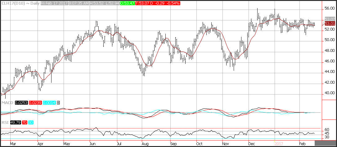 WTI crude prices are off on Friday but continue to consolidate near the 53 handle. The revelation of record crude and gasoline inventories this week in the U.S., along with continued signs of rising production in North America, have had a capping influence on the market in the face of OPEC-led supply trimming. Crude prices continue the historically usual path of stability, though sooner or later the volatility associated with this market will assuredly return.