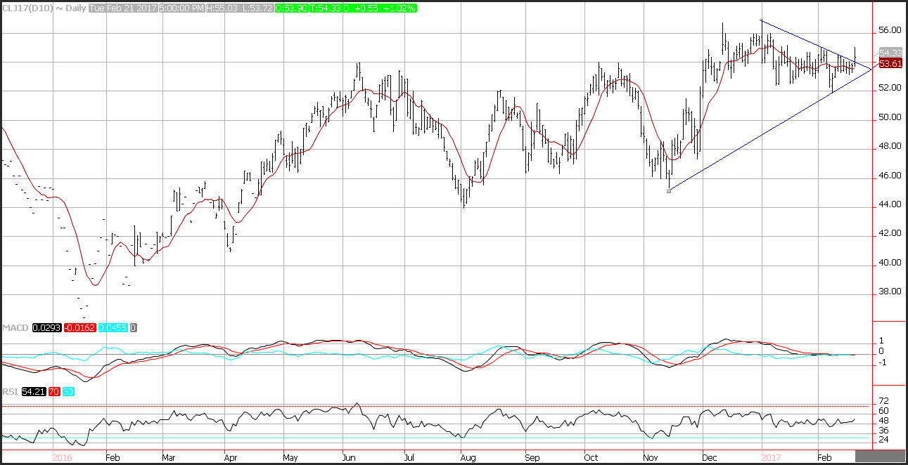 Crude broke out of its six-week trading range, topping at $55.03, and closing above trend line resistance seen near $54.07. Crude last hit these levels