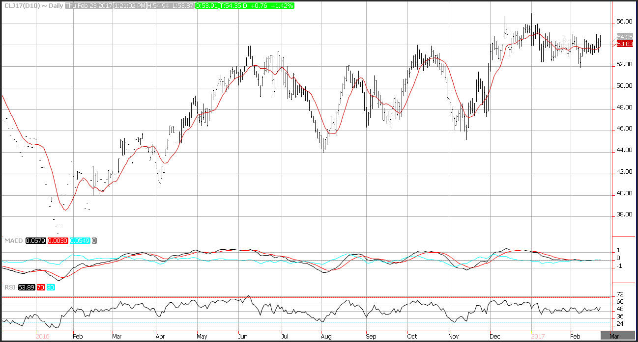 Crude oil prices moved higher climbing 1.4%, but failed to take out resistance near Wednesday’s highs near $55, after rising as much as 2.6% on the session. Prices received a jolt early from the larger than expected draw reported by the API, but the DOE’s numbers were more sanguine, allowing prices to ease back into their recent range. Support is seen near the 10-day moving average at $53.83. Momentum remains neutral as the MACD (moving average convergence divergence) index prints near the zero index level with a flat trajectory which points to consolidation.