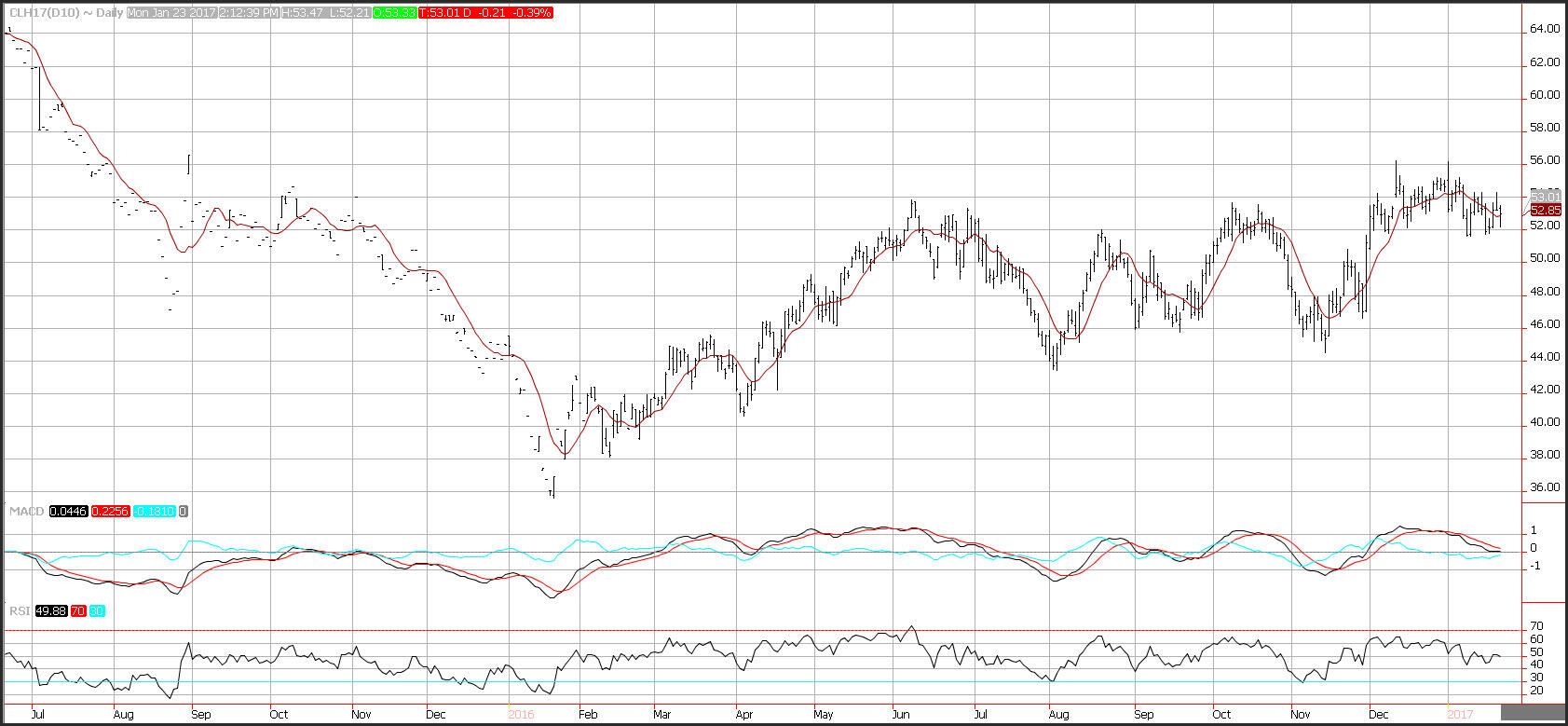 Crude oil prices closed lower down approximately 0.5%, at $52.85, well off its lows of $52.21. The market is corrected after running higher into the
