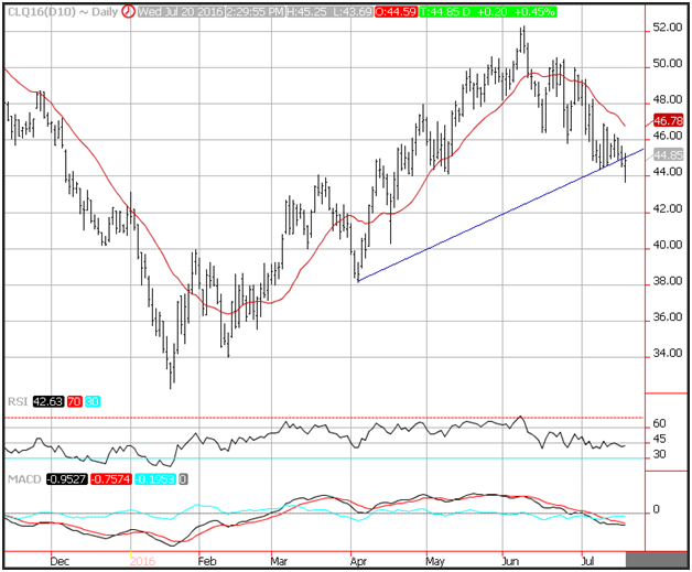 WTI Crude oil prices rebounded from below $43 dollars a barrel in tandem with Brent oil prices, following a mixed inventory report released by the Department of Energy on Wednesday. Prices skidded but remain below resistance which was former support created from an upward sloping trend line that conntects the lows in April to the lows in July and comes in near 45 per barrel. Additional resistance is seen near the 20-day moving average near 46.78.