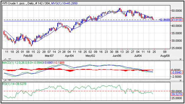 Resistance on crude oil prices is seen near the 10-day moving average at 45.29, while support is seen near the June lows at 42.86. Momentum has turned negative again as the MACD (moving average convergence divergence) index generated a sell signal. This occurs as the spread (the 12-day moving average minus the 26-day moving average) crosses below the 9-day moving average of the spread.  The RSI broke down below support reflecting accelerating negative momentum, which should lead to lower prices.