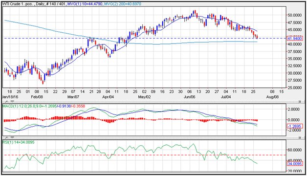 Crude oil prices slid below 42 per barrel, following an unexpected build in both crude oil and gasoline inventories. Prices are poised to test support near the 200-day moving average near 40.70, while resistance is seen near the 10-day moving average at44.48. Brent prices felling in tandem with WTI. The RSI (relative strength index) broke through support reflecting accelerating negative momentum while printing a reading of 34, which is on the lower end of the neutral range.