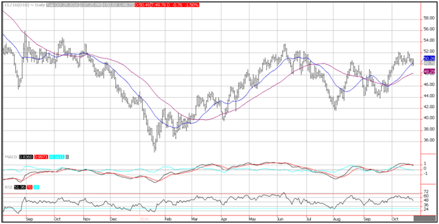 Crude oil prices moved lower on Tuesday in the wake of the news that Iraq has asked OPEC to be except from production caps. Prices slipped through support near the 20-day moving average at 50.26, after testing the 50.70 level earlier in the trading session. Support is seen near the 50-day moving average at 48.29. Traders await Wednesday inventory report from the EIA, which is expected to show an increase of 800K barrels.