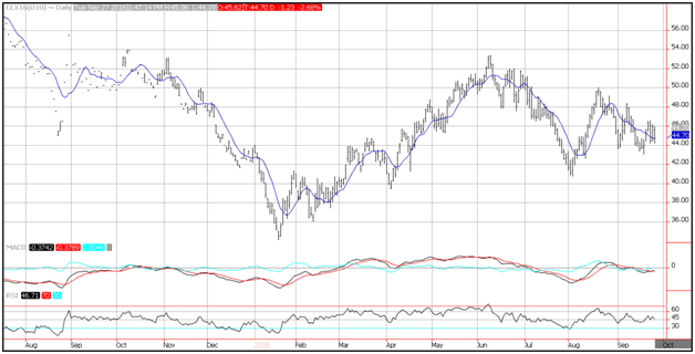 WTI crude oil prices hit a one-week lows of 44.20 before bouncing to 45.05, and then settling in near support at the 10-day moving average at 44.70.