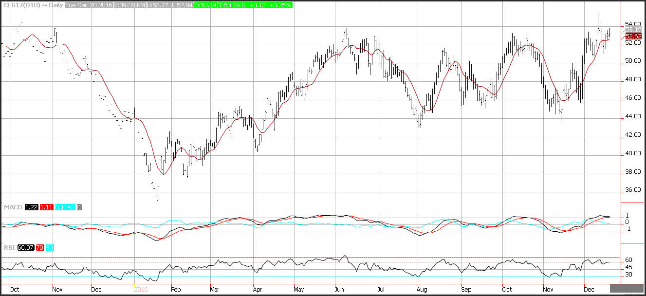 Crude oil prices edged higher on Tuesday settling off the highs of the session but climbing 0.25%. Prices made a higher high and a higher low which is indicative of an uptrend. The switch to the February contract has added the contango. Support is seen near the 10-day moving average at 52.62. Resistance is seen near the December highs at $55.44. Traders await inventory reports from both the API and the EIA. Expectations are for a draw given the seasonality of draws in crude oil and builds in products.