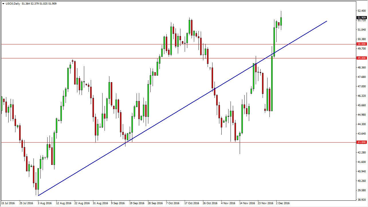 Brent markets rallied and broke to a fresh, new high during the day on Monday, as we continue to reach towards the $55 level. I would suspect that a pullback is probably necessary in this area, because just a couple of days ago, we were down at the $47 level. This is a very strong market now, but I think we need a pullback to find support. There is plenty of support just underneath, so I feel that the market will find plenty of buyers, especially down near the uptrend line that has been supporting this market for some time. Ultimately, this is the market reacting to an OPEC induced production cut, so it makes sense that we have the market reacting as we, but I also recognize that the oversupply will continue regardless of what OPEC does, because they do not have the power to turn off American or Canadian or even Mexican drillers. Ultimately, the demand simply isn’t there, so while it is a short-term bullish market, sooner or later reality comes crashing back down and into the market, pushing us much lower and back towards the $51 handle below.