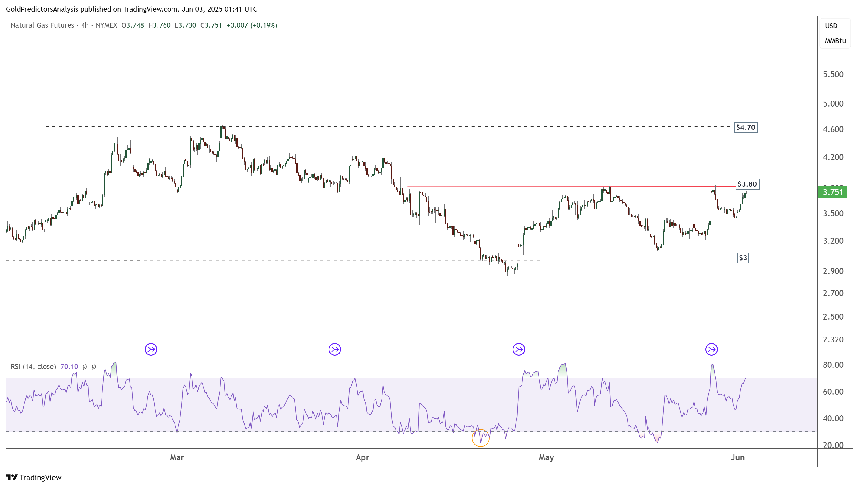 The 4-hour chart for natural gas shows strong consolidation between the $3.00 and $4.70 levels. The price consolidates below the $3.80 area, indicating continued uncertainty. However, the rebound from the $3.00 zone appears strongly bullish. A break above $3.80 would signal a move toward the $4.70 area. Further upside in natural gas prices would require a confirmed break above $4.70.