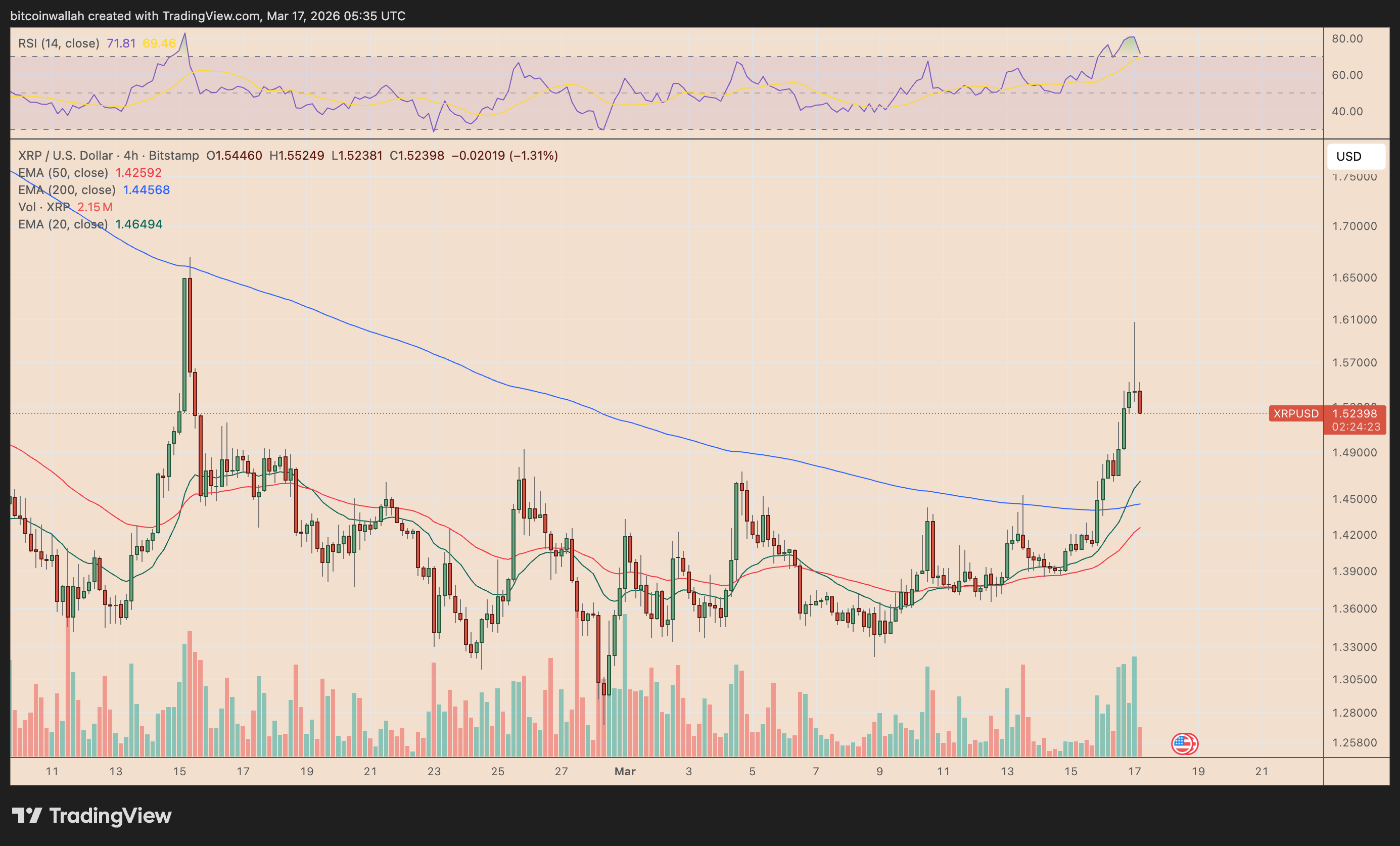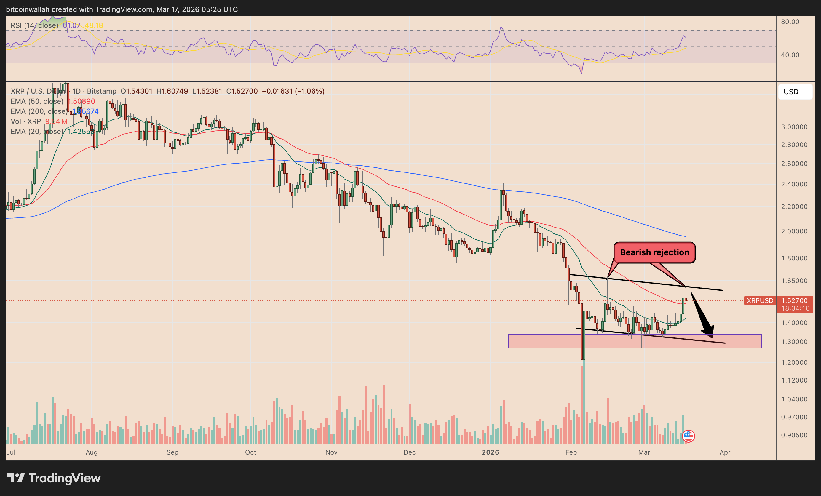 XRP’s daily chart suggests its recent rebound may be losing steam after the token faced a bearish rejection near the 50-day exponential moving average around $1.55.