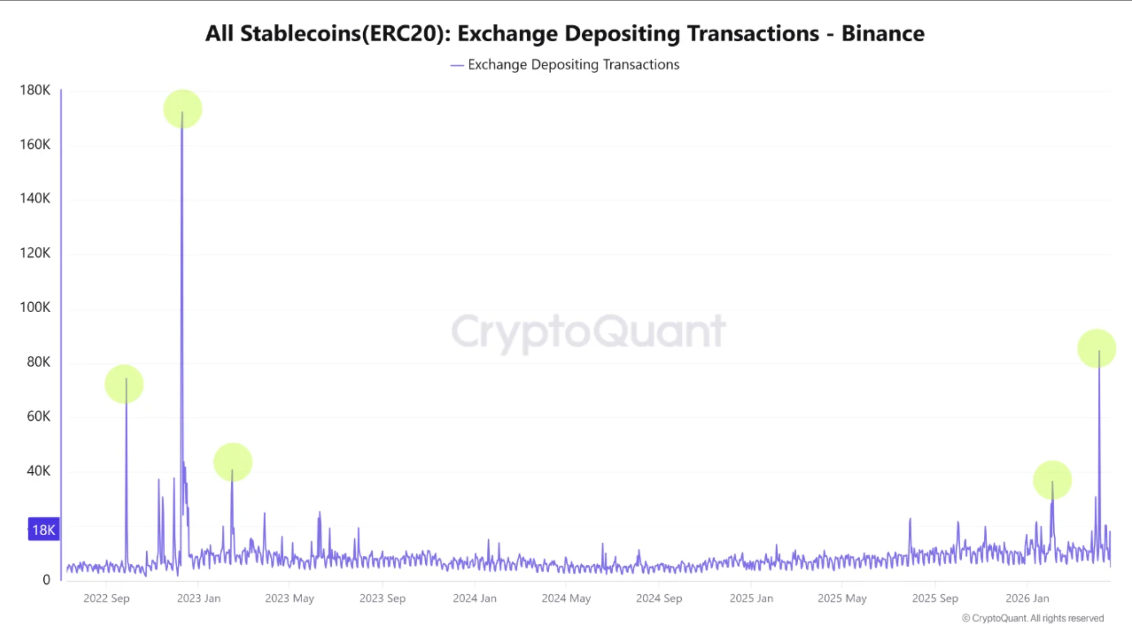 The number of ERC-20 stablecoin deposits to Binance has surged, briefly approaching 85,000 transactions per day, the highest level in months.